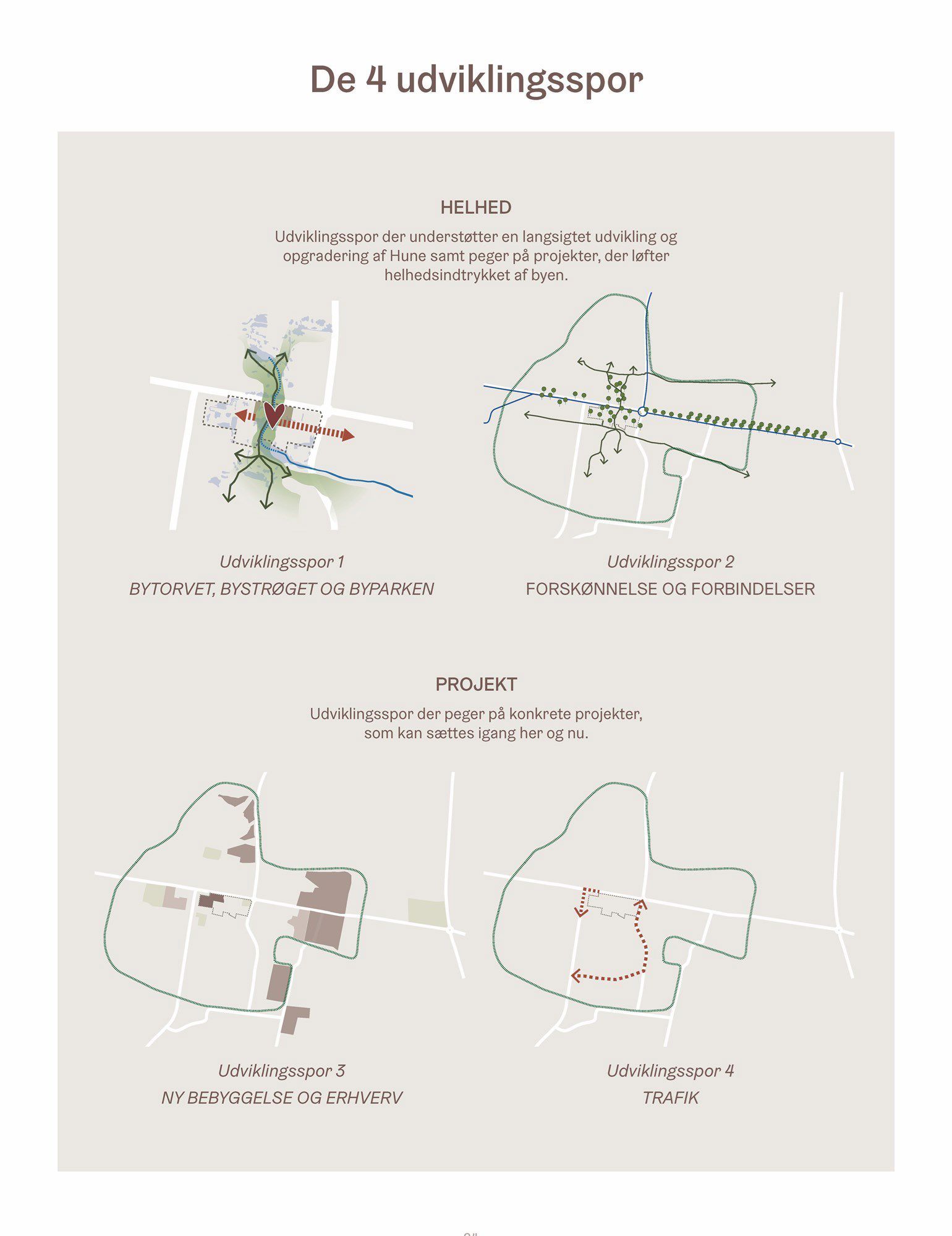 - Ny bebyggelse og erhverv: Masterplanen udpeger seks områder, som skal være de fremtidige udviklingsområder: 1) byens centrum, 2) Hune Grusgrav, 3) Plantagen, 4) Åparken, 5) Skovbrynet og 6) Heden.