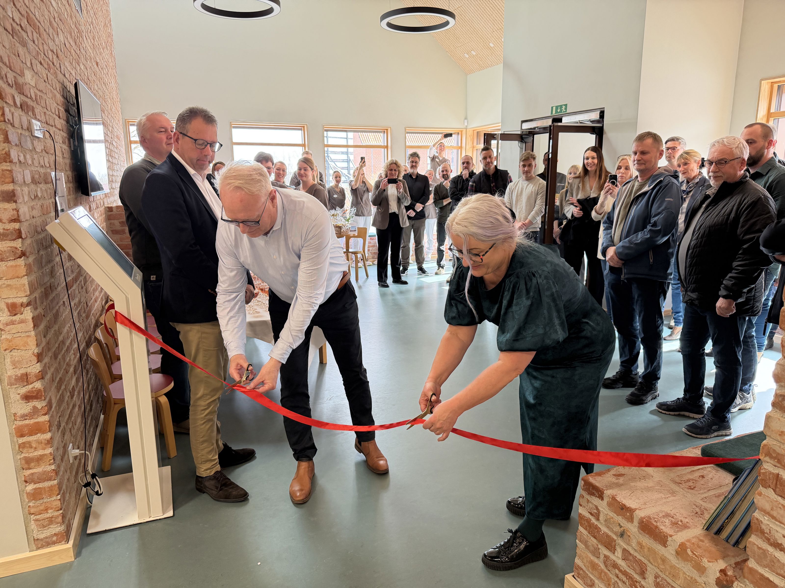 Formand og næstformand i Børne- og familieudvalget, Ulla Flintholm og Morten Klessen klippede snoren i klinikkens rummelige foyer - med smukke vægge bygget af genbrugssten fra den gamle administrationsbygning til Brovst Sygehus, som før lå på pladsen.