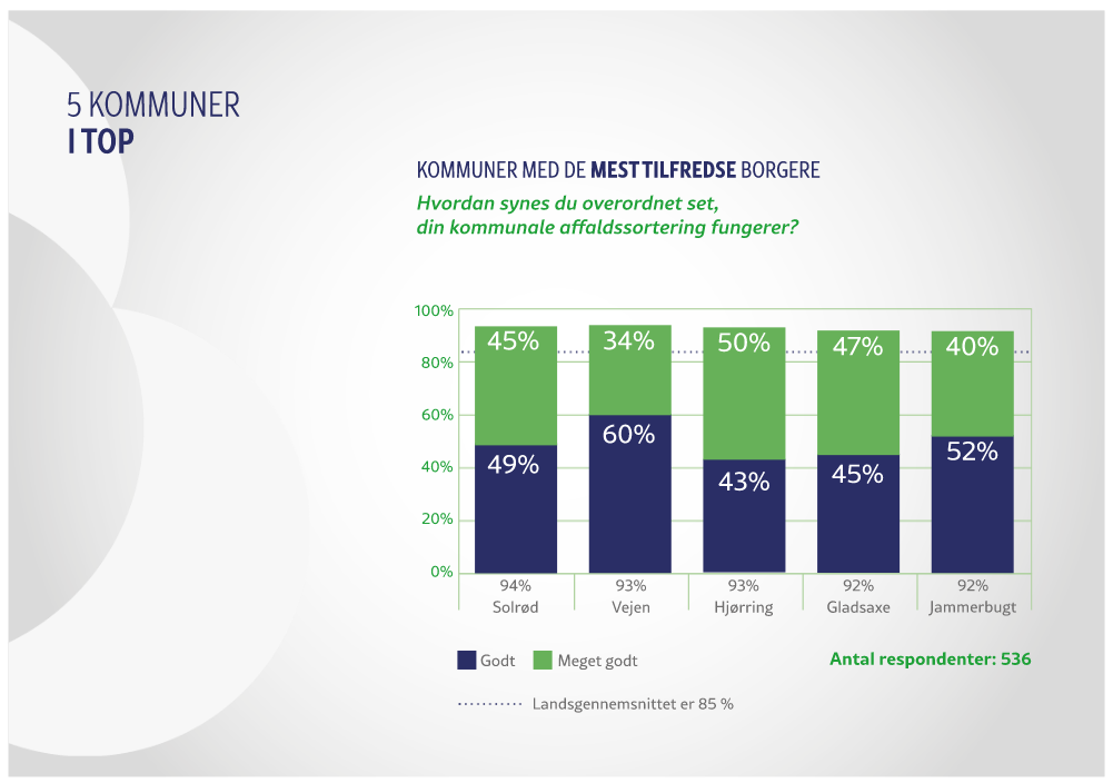 På landsplan er gennemsnitligt 85% af borgerne i en kommune godt tilfredse. Laveste tilfredshed ligger på 70% og højeste på 94%.